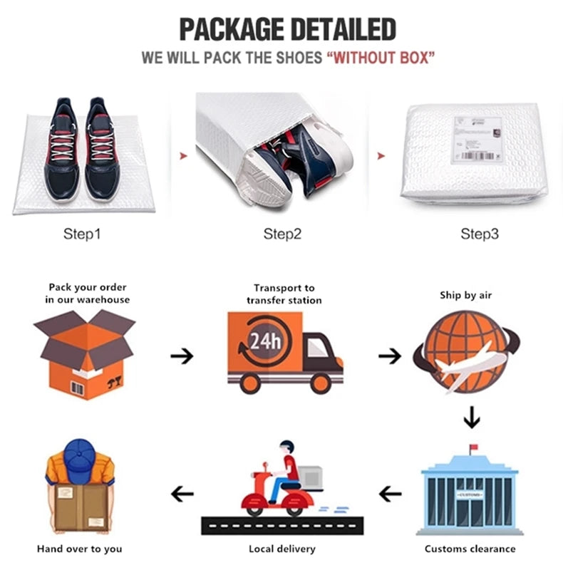 Pas de boîte par défaut – Pour faciliter la livraison et passer plus facilement les douanes, les chaussures sont expédiées sans boîte. Si vous souhaitez la boîte d’origine, merci de le préciser lors de la commande.